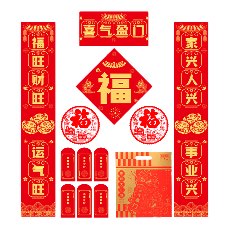 这款春节装饰品大礼包包含了春联、福字、斗方、红包和窗花等一系列精美的装饰品,专为春节家用和过年大门装饰而设计。每一件产品都蕴含着浓厚的春节文化,帮助你在家中营造出浓烈的节日氛围,增添欢庆的气息。